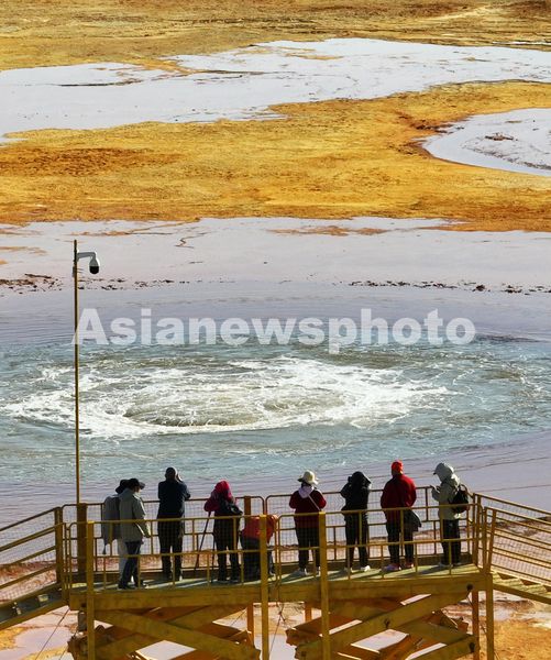 2024年9月25日,在青海省茫崖戈壁滩上艾肯泉景点,游人被大自然鬼斧神工的温泉“天眼”吸引。