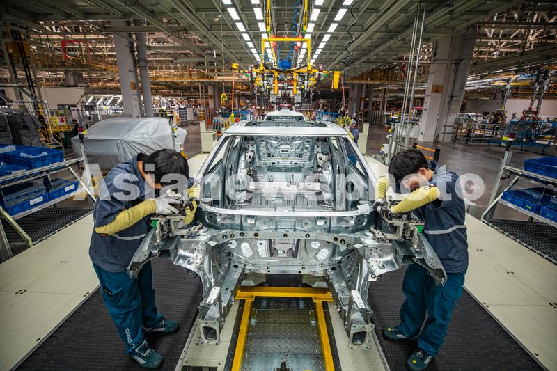 图片说明:2024年9月25日,安徽合肥,大众智能电动汽车工厂内,工人们正在工作。