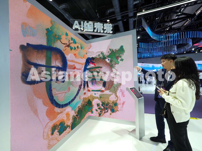 2024年9月25日,北京国家会议中心,观众在2024年中国国际信息通信展览会上中国电信展位体验“AI绘画”。