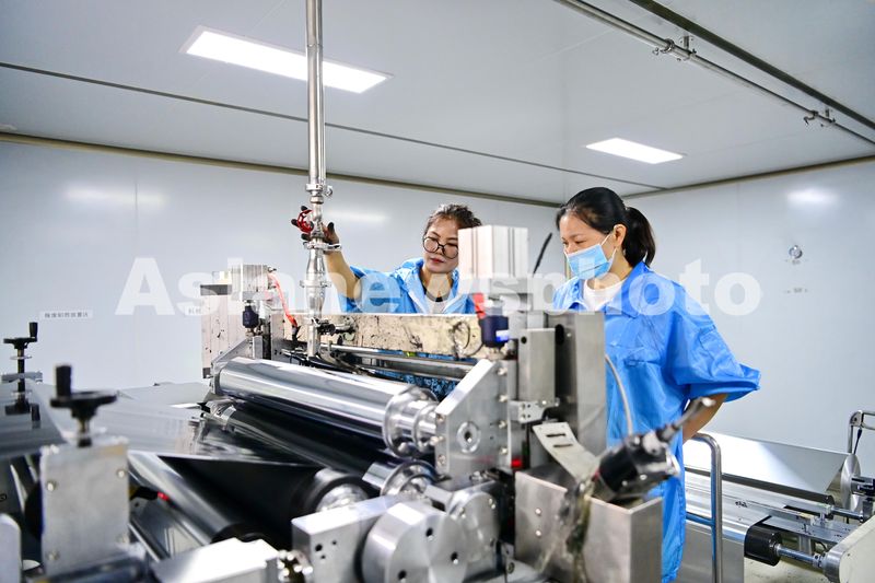 2024年9月26日,江西省抚州市广昌县工业园区的一家新能源科技公司锂电池生产车间里,自动化设备运转有序,工人在加工出口的新能源锂电池。