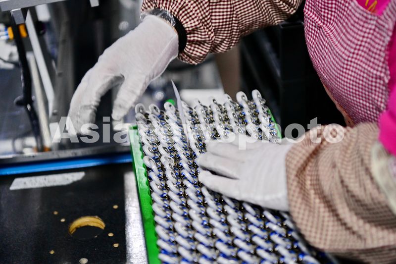 2024年9月26日,江西省抚州市广昌县工业园区的一家新能源科技公司锂电池生产车间里,自动化设备运转有序,工人在加工出口的新能源锂电池。