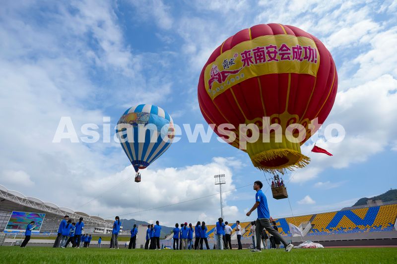 图片说明:2024年9月27日上午,福建省南安市新体育场,航空爱好者正在体验乘坐热气球。