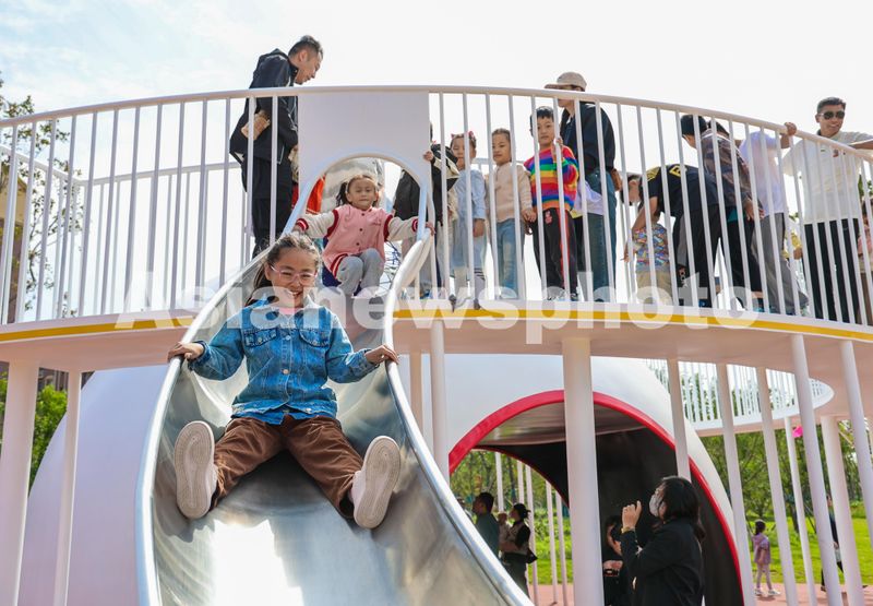 2024年10月1日,在治理后的废弃工厂区域山东省滕州市荆河街道铁西公园,小朋友正在刚启用的公园内游玩。