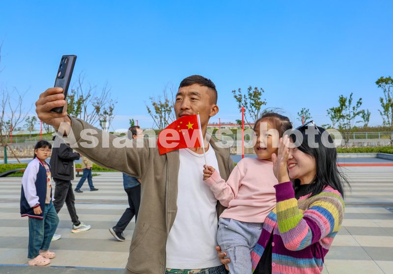 2024年10月1日,在治理后的废弃工厂区域山东省滕州市荆河街道铁西公园,市民正在刚启用的公园内合影留念。