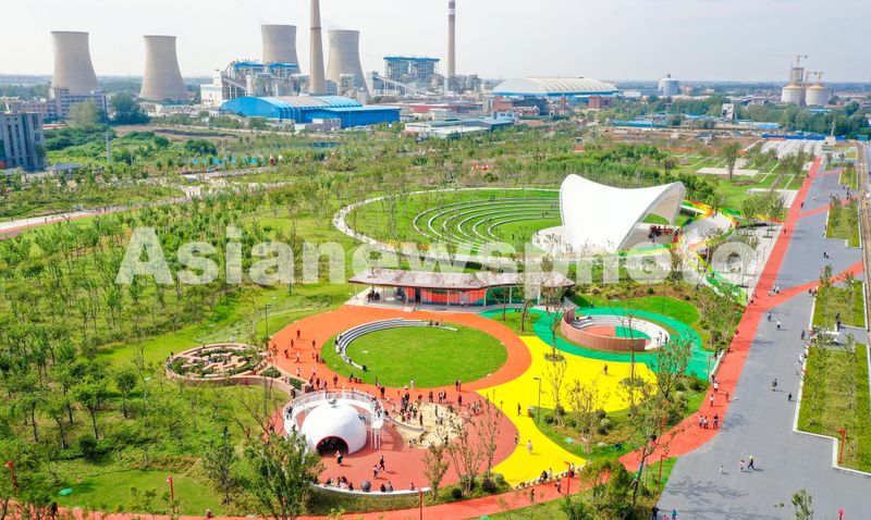 2024年10月1日,在治理后的废弃工厂区域山东省滕州市荆河街道铁西公园,市民正在刚启用的公园内游玩。