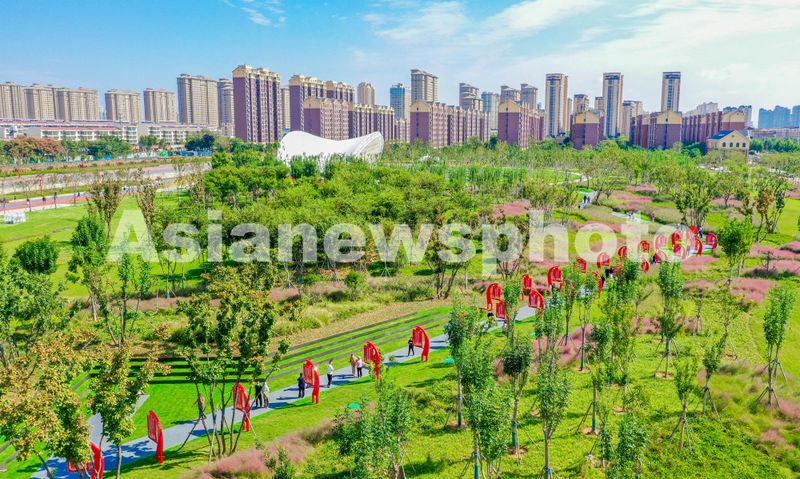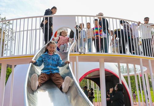 2024年10月1日,在治理后的废弃工厂区域山东省滕州市荆河街道铁西公园,市民正在刚启用的公园内游玩。