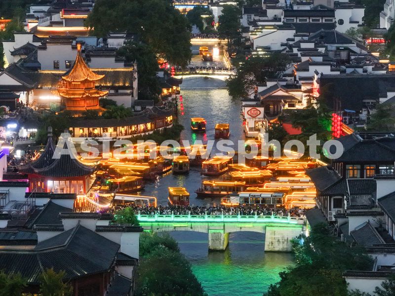 图片说明:2024年10月1日,人们在江苏省南京市夫子庙景区乘坐画舫夜游秦淮河。