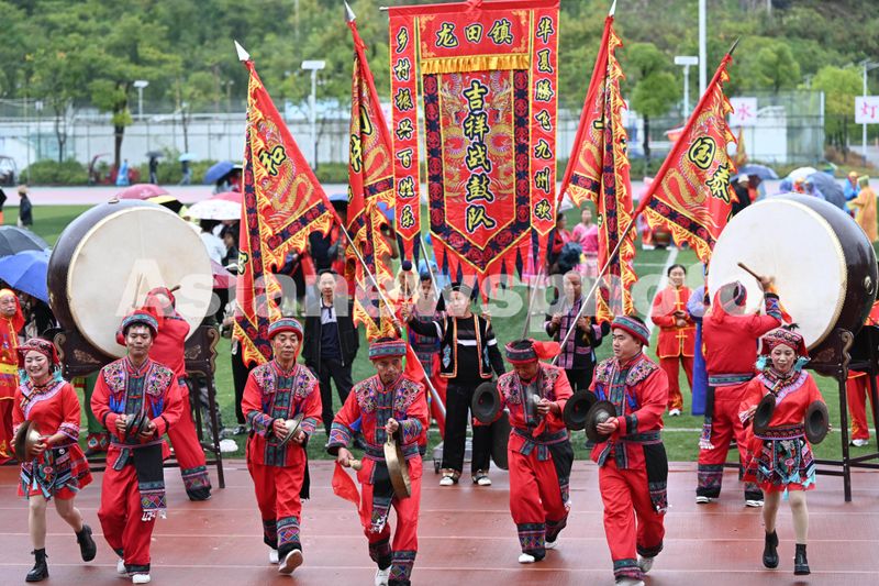 2024年10月1日,贵州省黔东南苗族侗族自治州岑巩县,身穿民族服饰的选手在思州战鼓大赛上表演斗战鼓。