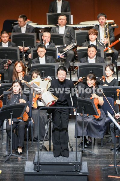 2024年10月1日,中国交响乐团音乐会在海南省海口市海南省歌舞剧院奏响, 指挥家景焕手捧鲜花答谢观众。