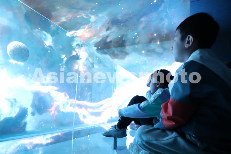 2024年10月2日,在山东省滨州市博兴县科技馆,小朋友在观看“裸眼5D”科普小电影。