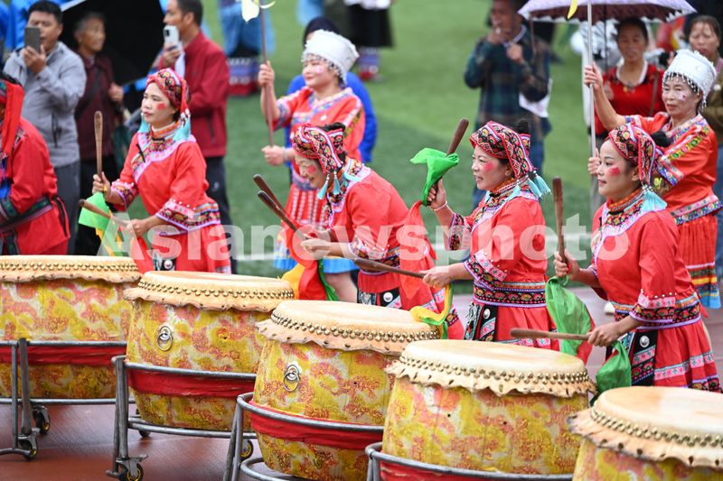 2024年10月1日,贵州省黔东南苗族侗族自治州岑巩县,身穿民族服饰的选手在思州战鼓大赛上表演斗战鼓。