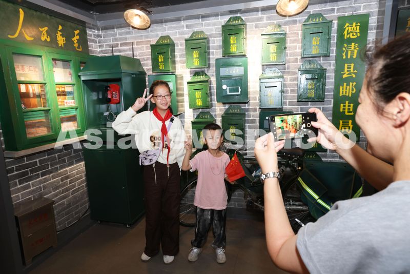 2024年10月2日,孩子在浙江省湖州市德清县乾元镇城关记忆馆合影留念。