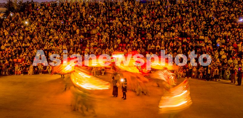 图片说明:2024年10月2日,在河南省洛阳市隋唐洛阳城国家遗址公园九洲池景区,艺人们正在为游客表演安徽省省级非遗项目“汪满田鱼灯”民俗巡游节目。