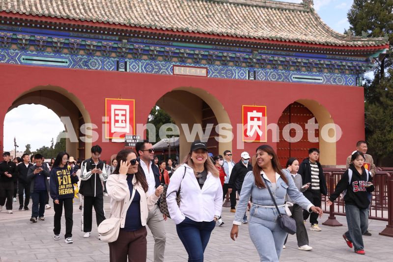 图片说明:2024年10月1日,游客在北京天坛公园参观游览。