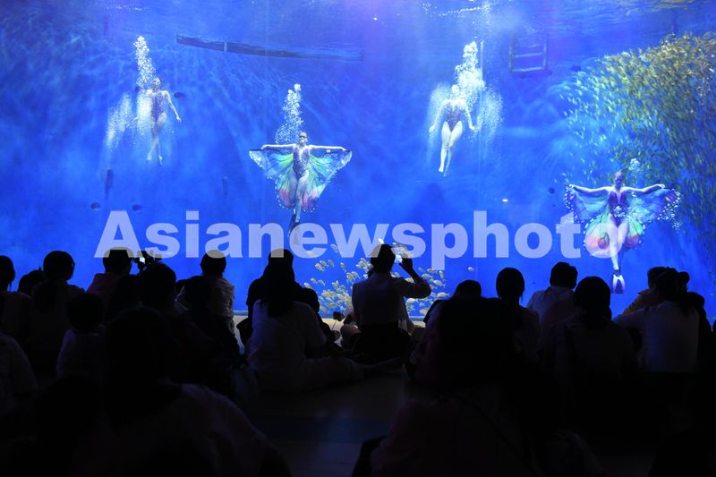 2024年10月1日,安徽省阜阳尧泰汉海海洋公园内上演的“水下蝶舞”表演吸引众多游客观看。