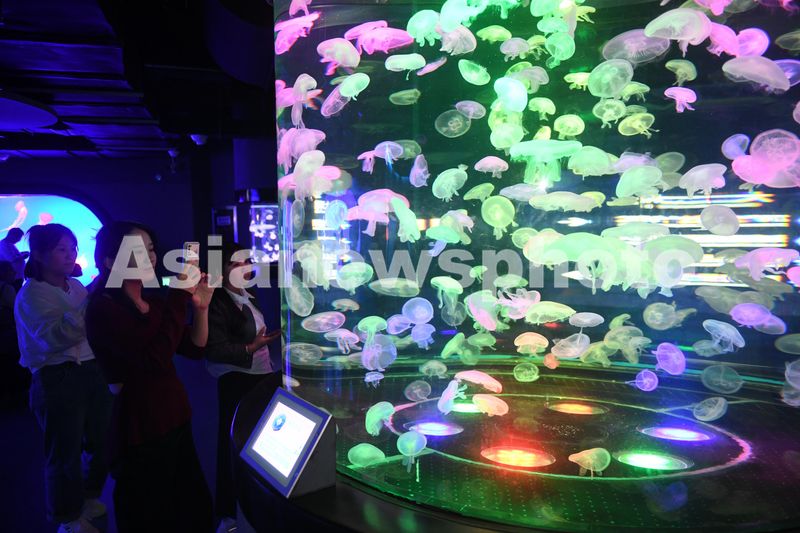 2024年10月1日,游客在安徽省阜阳尧泰汉海海洋公园内观赏水母展。