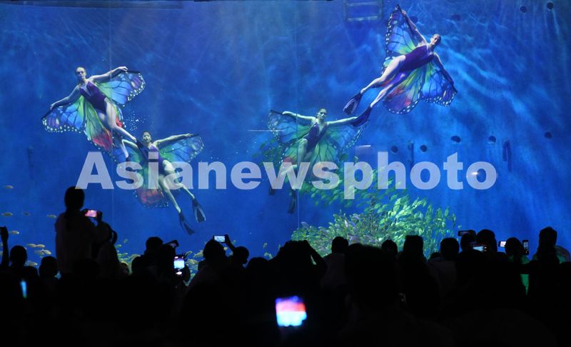 2024年10月1日,安徽省阜阳尧泰汉海海洋公园内上演的“水下蝶舞”表演吸引众多游客观看。