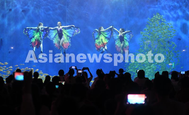2024年10月1日,安徽省阜阳尧泰汉海海洋公园内上演的“水下蝶舞”表演吸引众多游客观看。