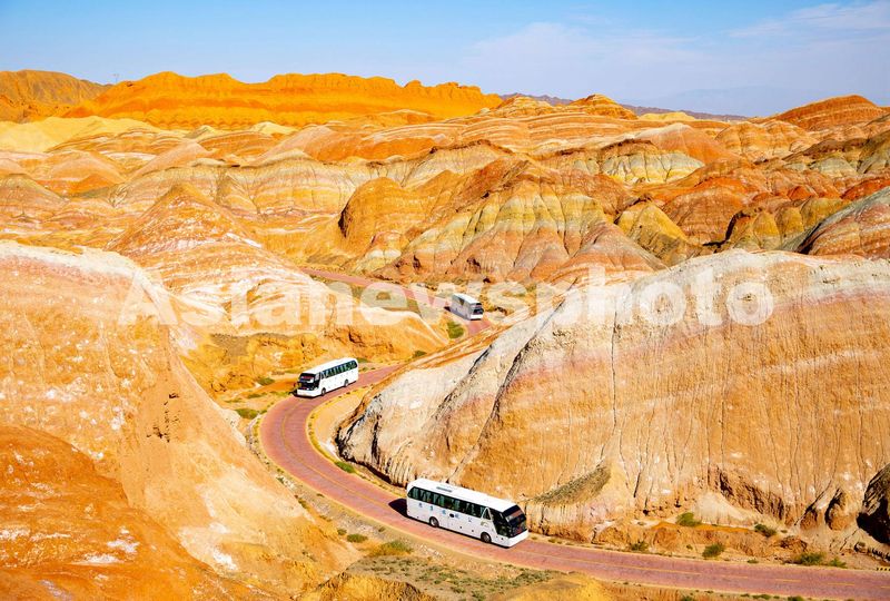 2024年10月3日,三辆旅游大巴车行驶在张掖七彩丹霞景区。