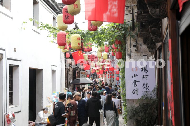 2024年10月4日,浙江省金华市金东区岭下镇,游人在坡阳古街赏玩游览。国庆期间,金华市坡阳古街举办生活艺术市集,设有国庆爱国主题打卡点,吸引各地游客拍照留念。