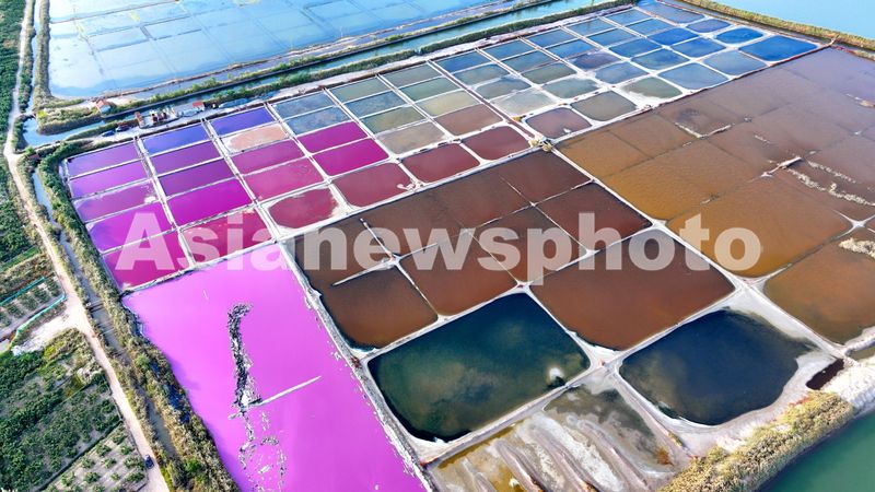 图片说明:2024年10月5日,在山东省荣成市港西镇朝阳港拍摄到的五彩缤纷的盐田。