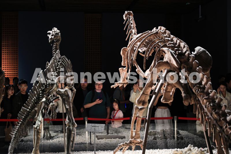 10月5日,游人在南京博物院参观展出的恐龙化石。