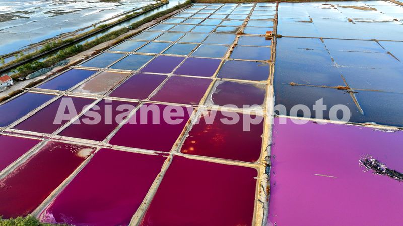 图片说明:2024年10月5日,在山东省荣成市港西镇朝阳港拍摄到的五彩缤纷的盐田。