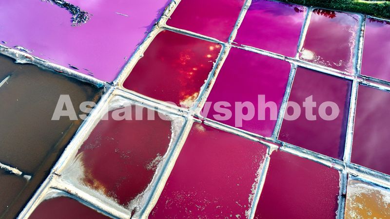 图片说明:2024年10月5日,在山东省荣成市港西镇朝阳港拍摄到的五彩缤纷的盐田。