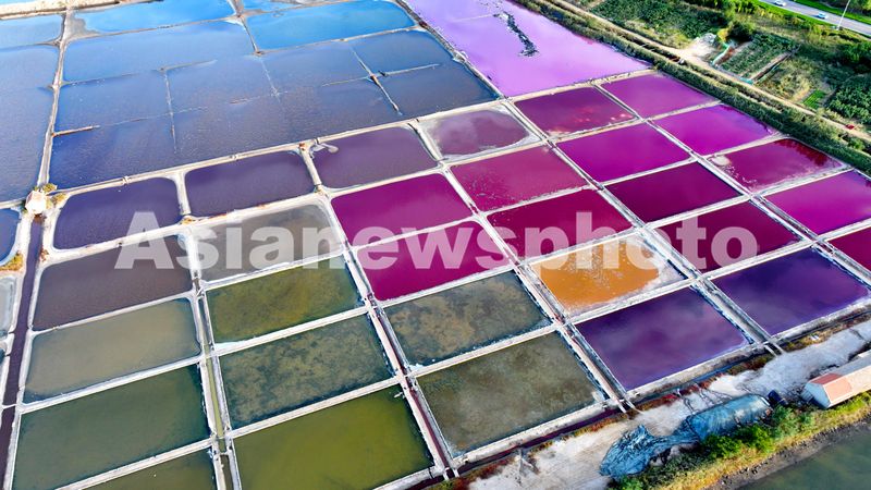 图片说明:2024年10月5日,在山东省荣成市港西镇朝阳港拍摄到的五彩缤纷的盐田。