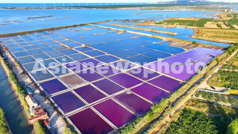 图片说明:2024年10月5日,在山东省荣成市港西镇朝阳港拍摄到的五彩缤纷的盐田。