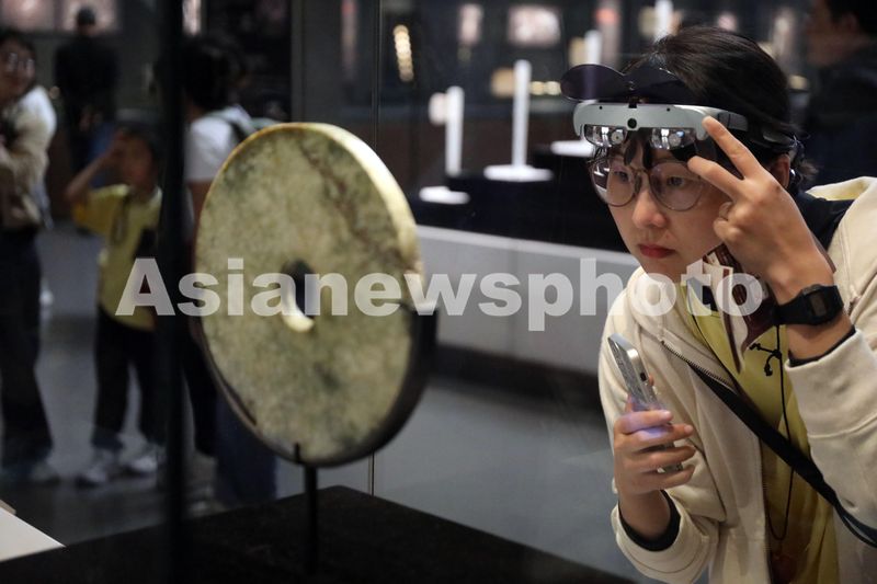 2024年10月5日,浙江省杭州市余杭区良渚博物院,游人在观赏展品。