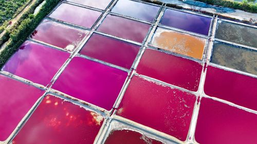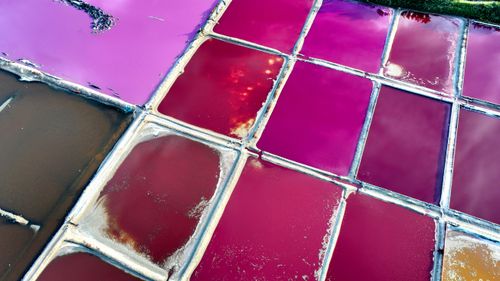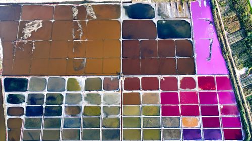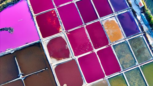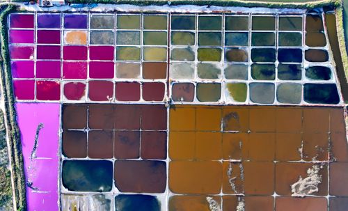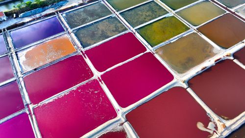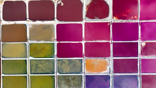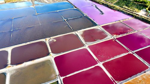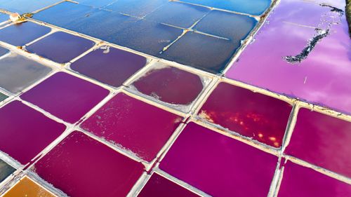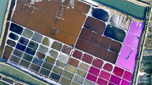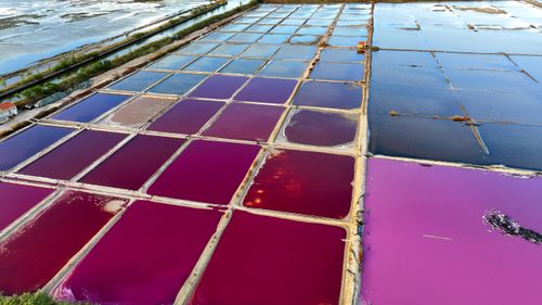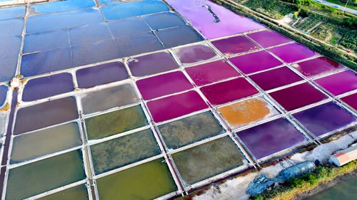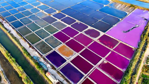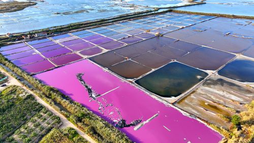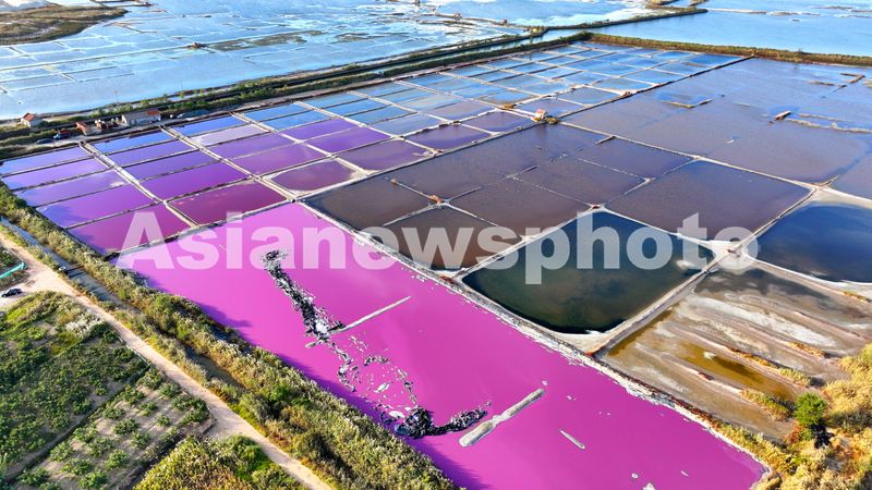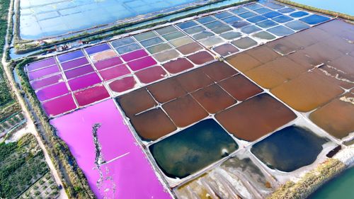 2024年10月5日,空中俯瞰山东省荣成市港西镇朝阳港一处盐田,当卤水进入盐池后,经过一夏天的晾晒,随着海水不断蒸发,进入秋季,浓度逐渐变大,呈现出色彩斑斓的结晶状态,像是被大自然打翻的调色盘,宛如神秘大地呈现的一片艺术画布,形成一道靓丽的风景线,深受游客青睐。