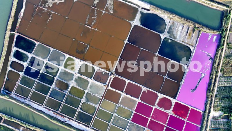 图片说明:2024年10月5日,在山东省荣成市港西镇朝阳港拍摄到的五彩缤纷的盐田。