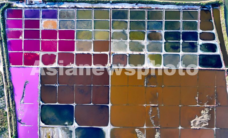 图片说明:2024年10月5日,在山东省荣成市港西镇朝阳港拍摄到的五彩缤纷的盐田。