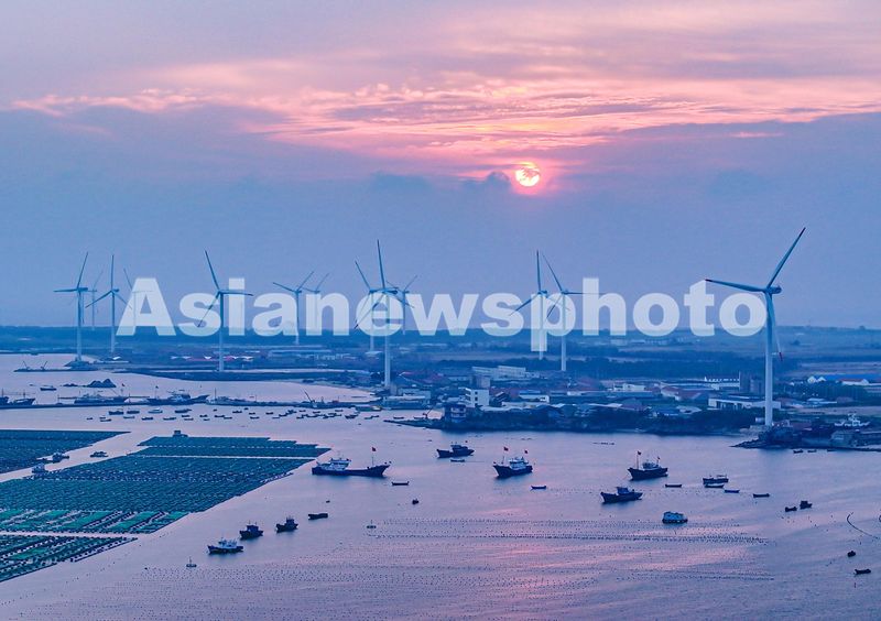 2024年10月7日,山东省荣成市石岛管理区桑沟湾国家级海洋牧场周边,风力发电机组在转动作业。