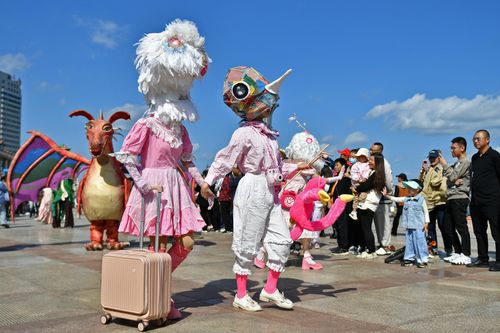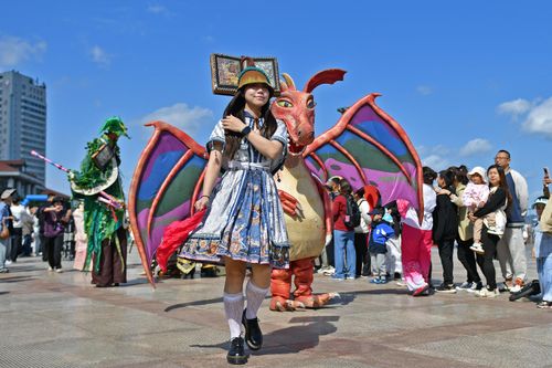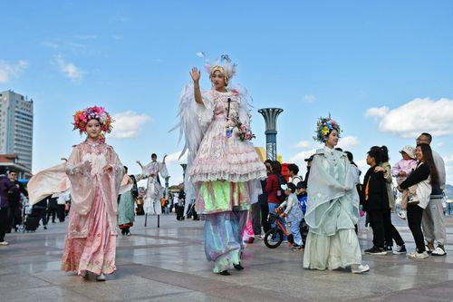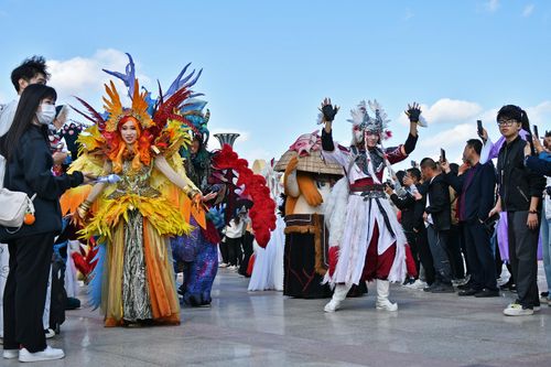 2024年10月1日,在山东省烟台市芝罘区滨海广场,角色扮演者装扮成游戏中的角色巡游表演。国庆假期,越来越多的时尚青年更加注重旅游的品质化观感和个性化体验,享受“松弛感”、追求“潮范儿”成为假日新时尚。各地消费场景不断“上新”,实现与游客的“双向奔赴”。