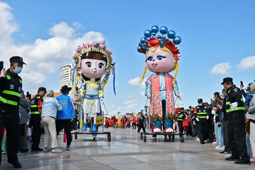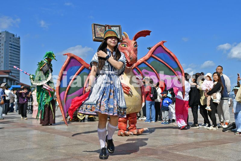 2024年10月1日,在山东省烟台市芝罘区滨海广场,角色扮演者装扮成游戏中的角色巡游表演。