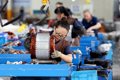 2024年10月10日,工人在福建福凯电气有限公司生产车间进行电机配件组装。