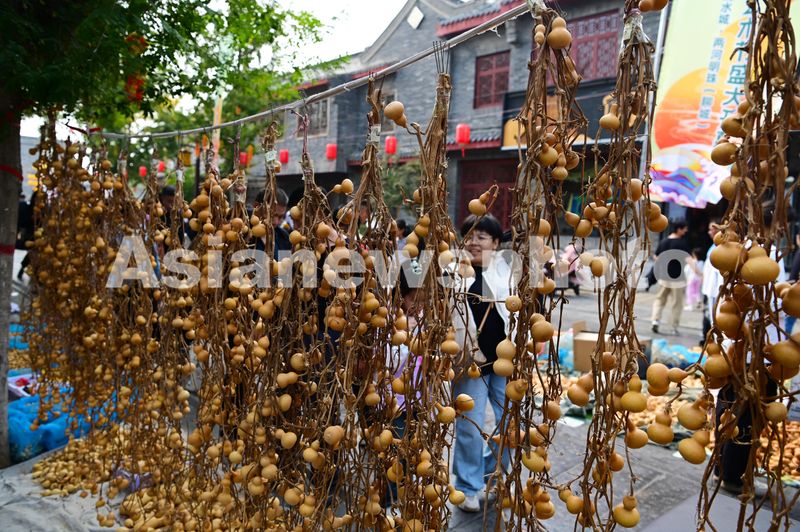 图片说明:2024年10月13日,在第十六届中国江北水城.两河明珠(聊城)葫芦文化艺术节上,一棵棵挂满小葫芦的葫芦藤,吸引了许多游客观赏、选购。