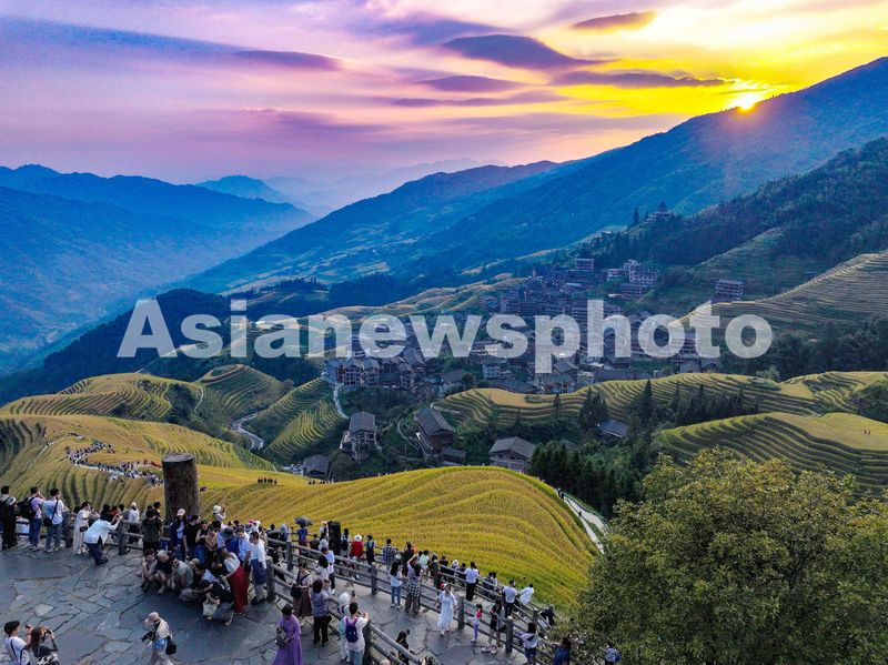 2024年10月12日,游人在广西桂林市龙胜各族自治县平安村观赏龙脊梯田日落美景。
