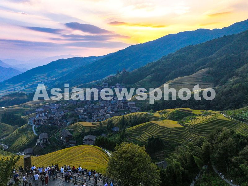 10月12日,游人在广西桂林市龙胜各族自治县平安村龙脊梯田游览。
