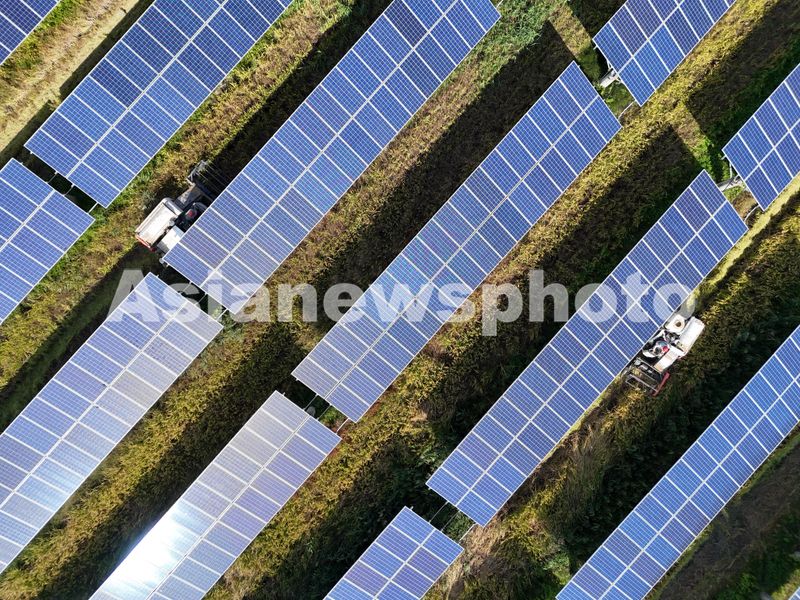 2024年10月15日,浙江省乐清市胜利塘内的“农光互补”光伏发电项目基地,滩涂盐碱地种植的水稻迎来丰收,收割机在光伏板间来回穿梭收割稻谷。