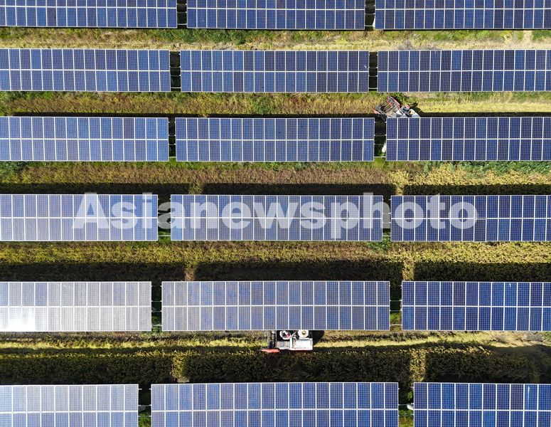2024年10月15日,在浙江省乐清市胜利塘内的“农光互补”光伏发电项目基地,农机手驾驶收割机收割稻谷。