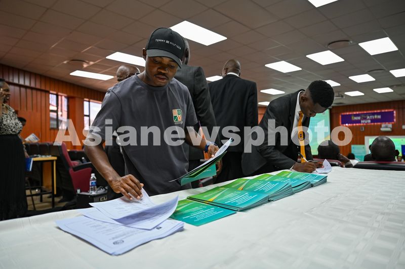 图片说明:当地时间2024年10月11日,津巴布韦大学,当地参会师生领取会刊。