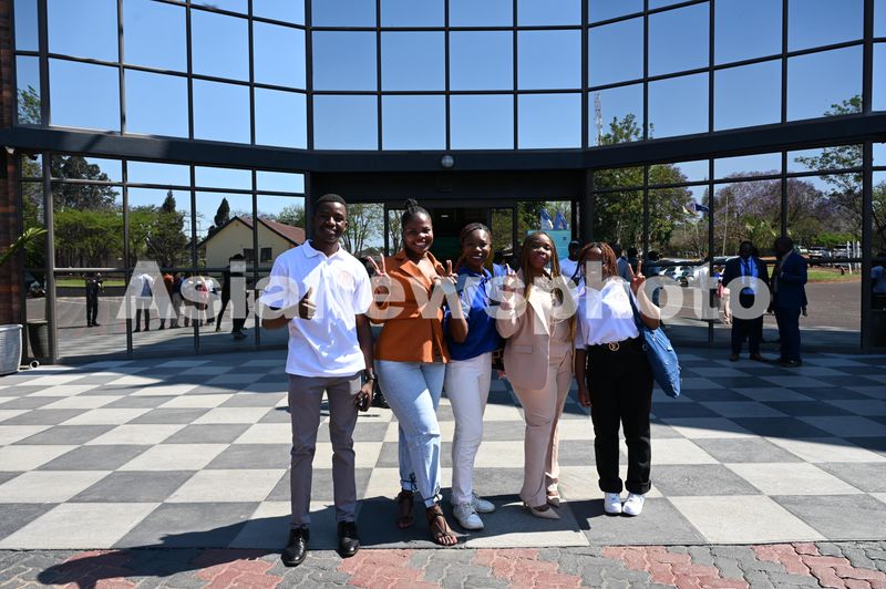 图片说明:当地时间2024年10月11日,津巴布韦大学,当地参会师生在会场门口拍照留念。