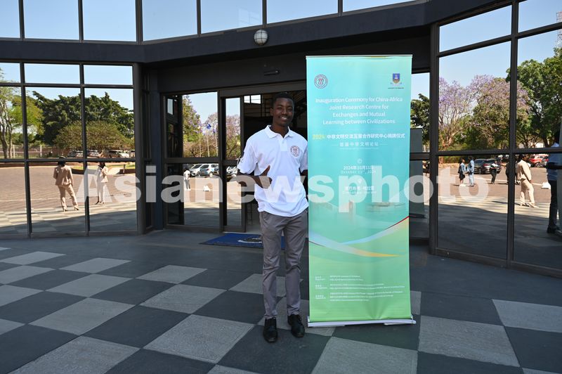 图片说明:当地时间2024年10月11日,津巴布韦大学,当地参会师生在会场门口拍照留念。