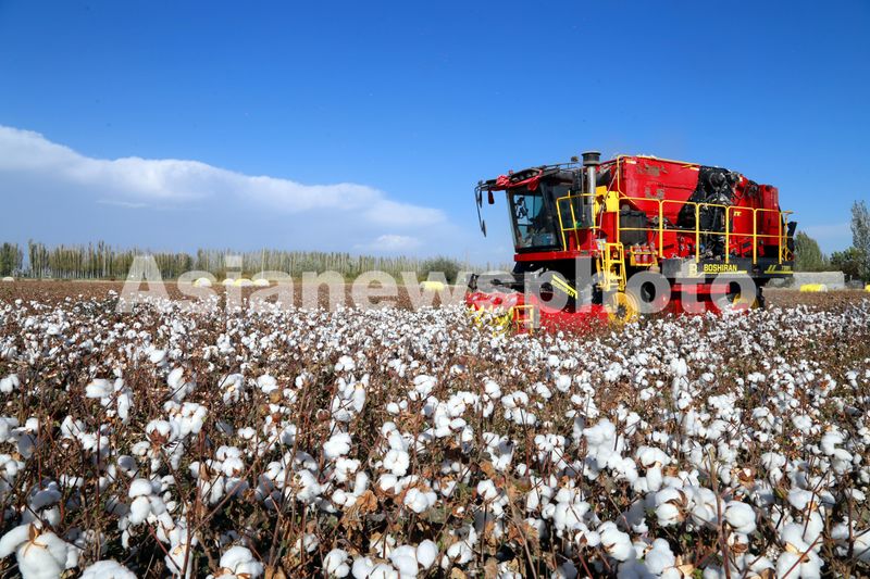 2024年10月17日,在新疆阿克苏地区阿瓦提县阿依巴格镇幸福村,采棉机在棉田里来回穿梭采收棉花。
