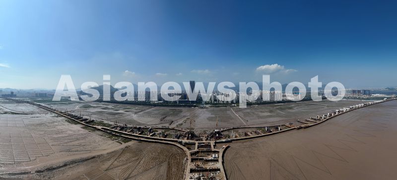 图片说明:2024年10月18日,俯瞰正在建设中的温州市乐清湾滨海大道桥梁项目。