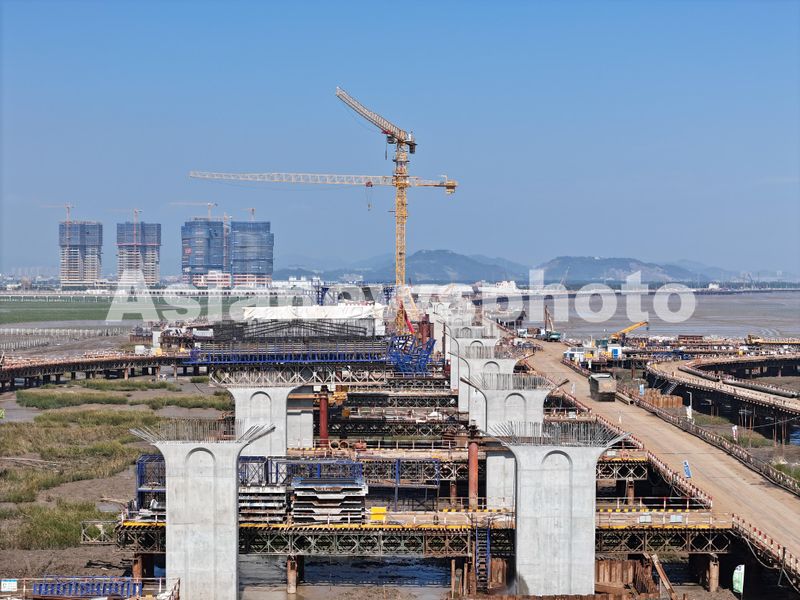 2024年10月18日,浙江省温州市乐清湾滩涂区域,滨海大道桥梁建设现场塔吊林立,工人在加紧桥墩等施工,工程建设稳步推进。该项目工程主线长度5.953km,采用一级公路兼顾城市道路功能技术标准,其中乐清湾沿海滩涂区域采用“桥堤结合”、跨越海涂造桥方案,加强沿海滩涂的开发利用和生态环境保护。