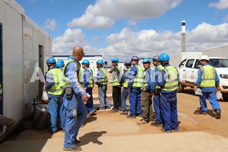 2024年4月4日,正在建设中的南非红石100兆瓦塔式熔盐光热电站项目施工现场,中方工人排队打午饭。